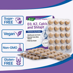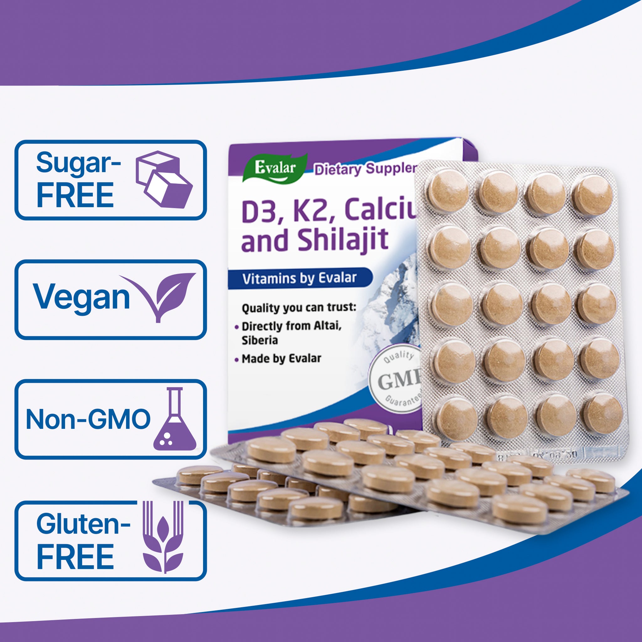 Formulated with plant-based Calcium, Vitamins D3, K2, and pure Altai Shilajit, the supplement supports healthy bones, teeth, and immune function. Each tablet contains nature-sourced nutrients with high bioavailability and proven synergistic benefits.