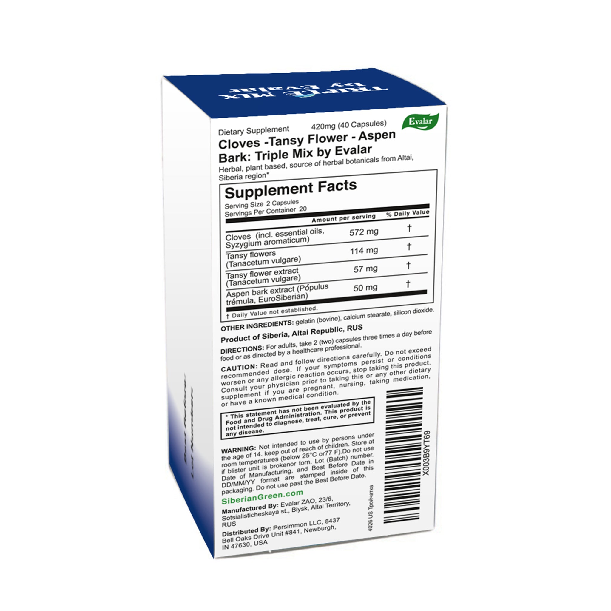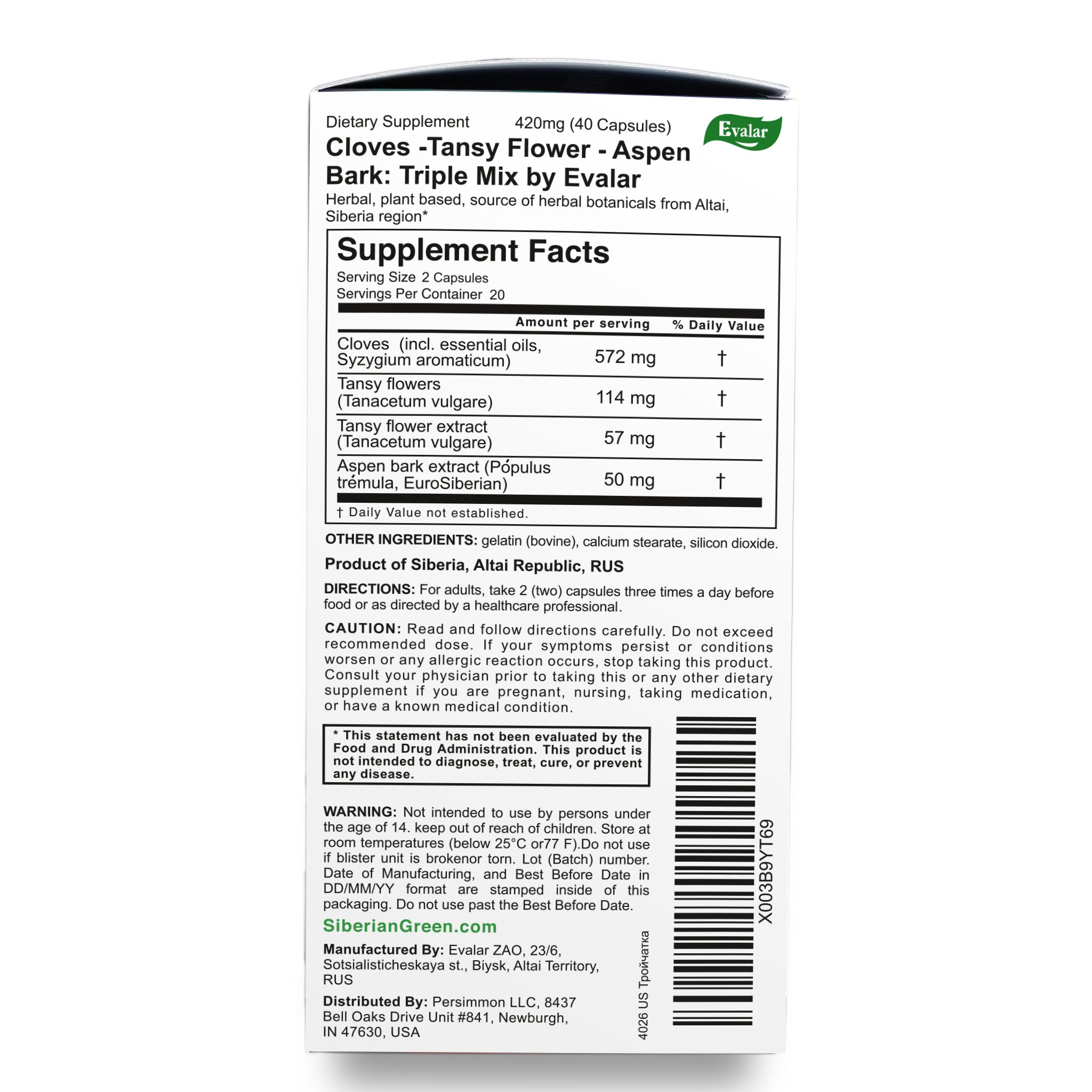 Cloves, Tansy & Aspen Herbal Mix – Evalar 40 Capsules