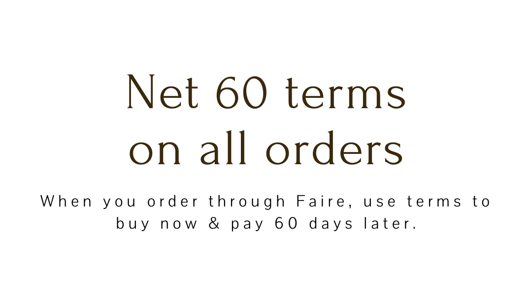 We’ve partnered with Faire to sell our wholesale products online. Join Faire today to shop our line and get $200 off and 1 year of free shipping.*