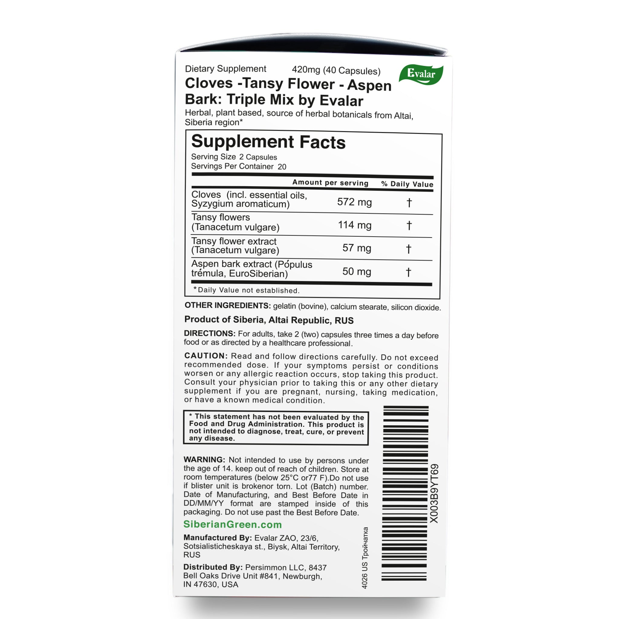 Cloves, Tansy & Aspen Herbal Mix – Evalar 40 Capsules