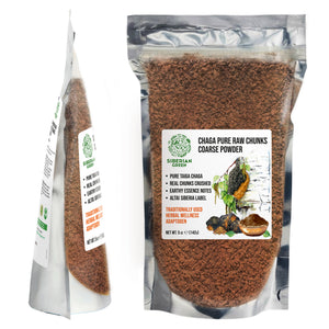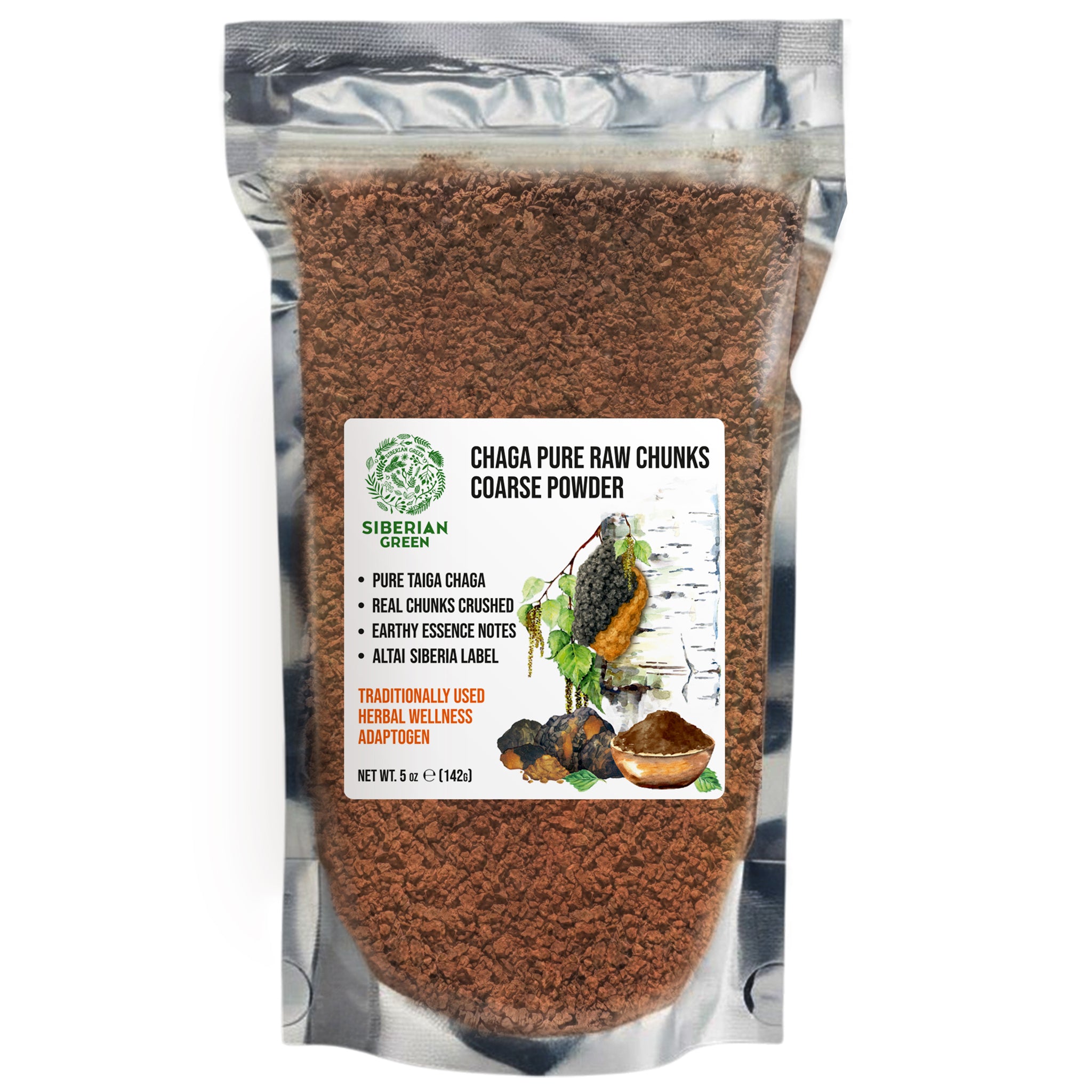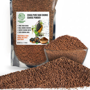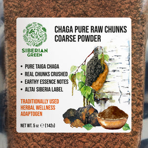 Experience the rich, earthy essence of Siberian Green Chaga Pure Raw Chunks Coarse Powder, a premium wildcrafted chaga mushroom sourced from birch trees in the remote forests of South Siberia. Known as one of the most respected functional mushrooms, chaga features a deep, smooth flavor that is ideal for brewing chaga mushroom tea, decoctions, and plant-based wellness drinks.