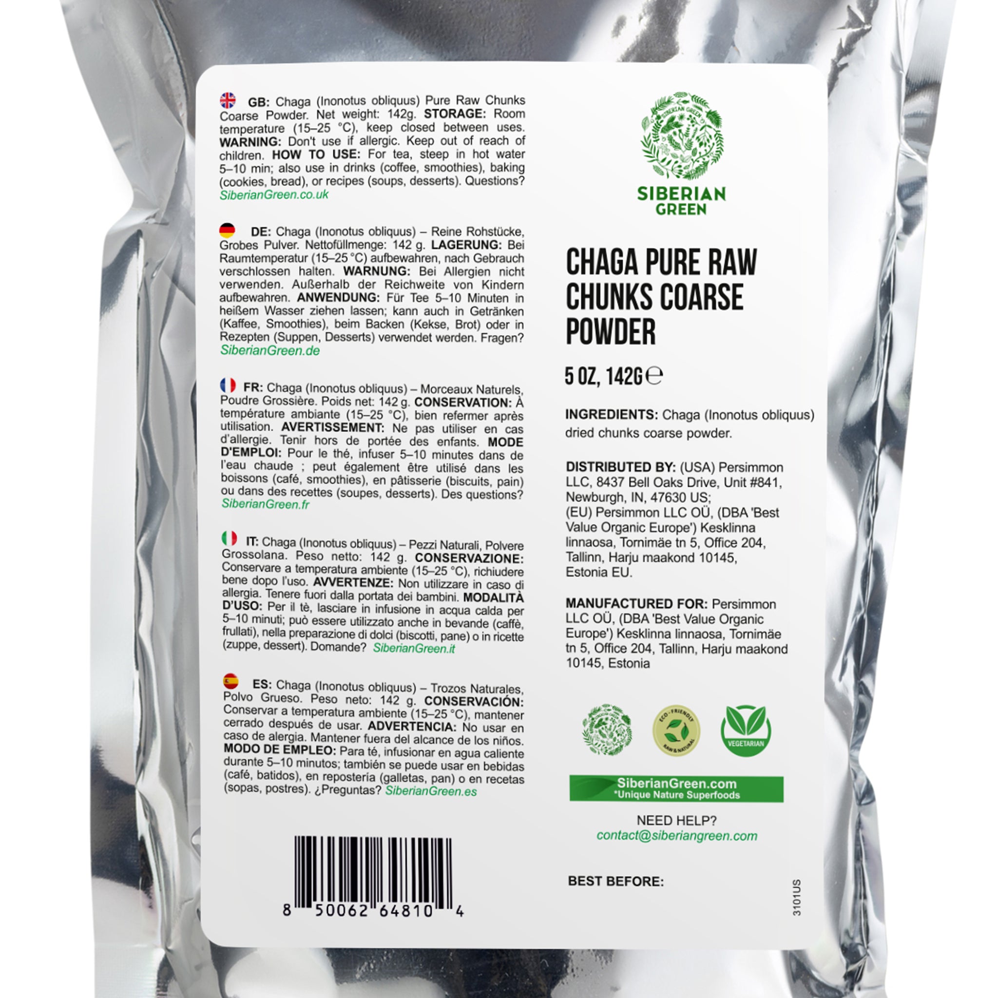 100% Wild-Harvested Siberian Chaga – sustainably sourced from birch trees in the pristine forests of South Siberia, naturally potent and chemical-free. Clean and Natural Ingredients – Non-GMO, no fillers, no artificial additives, just pure chaga mushroom (Inonotus obliquus). Rich in Antioxidants and Adaptogens – supports immune balance, natural energy, daily vitality, and overall wellness. Versatile and Easy to Use – perfect for herbal teas, coffee alternatives, smoothies, baked goods, and functional wellness drinks. Vegan and Gluten-Free – 100% plant-based, ideal for holistic and plant-powered lifestyles.
